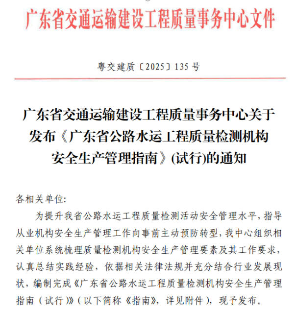 | 喜讯! 《广东省公路水运工程质量检测机构安全生产管理指南(试行)》正式发布! |
